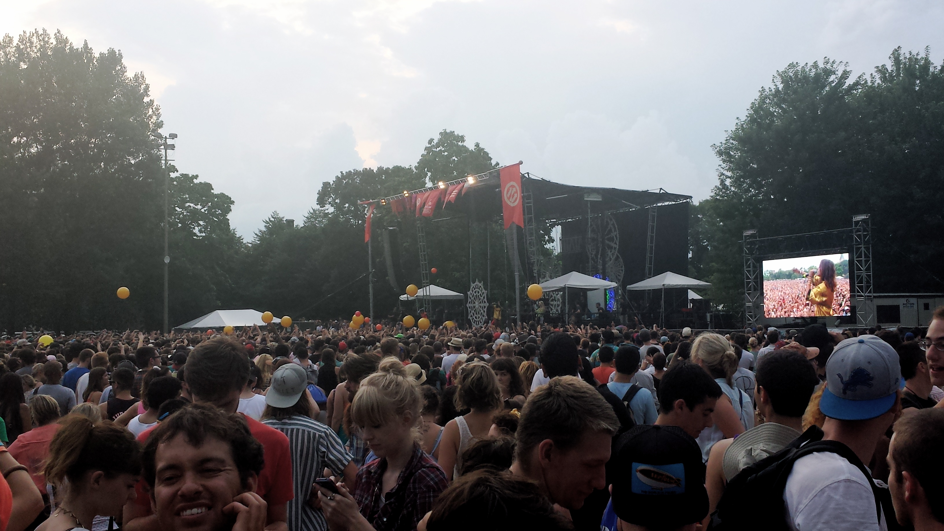 The day starts with drinking–because of course–and some waffle breakfast tacos (by the way, Taco Bell needs to desperately get on this) and then we finally make our way into Union Green Park to catch the bands for the day. Friday wasn’t my favorite really; I was really only excited for Bjork to get all weird and didn’t much care about anyone else that day. Joanna Newsom was lovely despite the fact that I was way too far away to really enjoy her harp-jamming and subtle and angelic vocals (it says a lot that she could command a crowd of hot, sweaty and intoxicated kids doing this by the way). Meanwhile my friend Katie was still stuck trying to find her appeal or why someone who looks 14 could get so many males to call her hot. Also, I guess it was cool hearing Savages play what sounded like the same song for 45 minutes–at the very least, it’s a good song. For me though, it was all about Bjork and she didn’t disappoint. Armed with a giant squishie ball helmet and a groovy alien choir backing her up, she put on a great set of noise that people like me somehow think of as music. Of all the sets this weekend, hers was the most technically impressive (M.I..A. was a close second); she had lights and funky screen projections and was all prepared to dazzle until Sharknado showed up to wreak havoc on Chicago and cut her set off early. Afterwards, we braved that hellrain to get to an aftershow featuring Classixx and Chromatics in order to dance ourselves dry and listen to some dreamy dance music. I’m running on almost 48 hours without sleep and still drinking so I’m trying to keep moving and dancing in order to not pass out on the dancefloor (and if you think I’ve never fallen asleep in a club before, you’re sorely mistaken). By the time I made it back to the room I was half-asleep, my feet hurt and at some point me and three people shared a pizza at 2 in the morning: it was a good day.