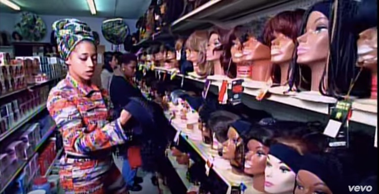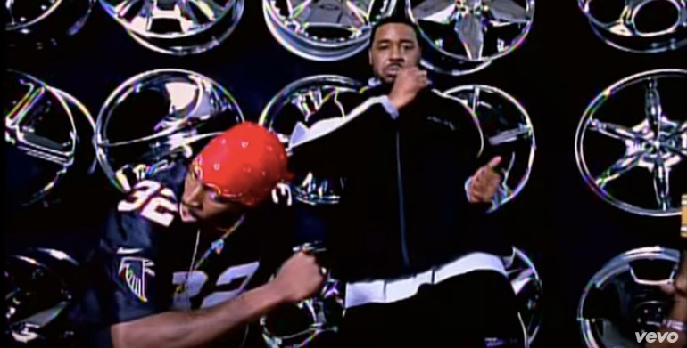 Nelly is committed to showing out for every St. Louis sport in this video. Here he has an immaculate St. Louis Blues hockey sweater with the matching hat that has his name on the back which, again, so perfect for that time period. The video girl in this scene keeps it simple with the tank and the bandana round her head like she 2pac. She seems to be waring a collar around her neck. The accessories here are pretty great: Nelly’s wrist is covered in an almost irresponsible amount of diamonds and this woman’s collar gives off a hint of danger to her, like she might be down for some wild shit and you will have no say in the manner. Of course that could just be me revealing more about myself than necessary. And don’t think I don’t notice that this is happening in a rims shop, one of my favorite former set pieces of old music videos.